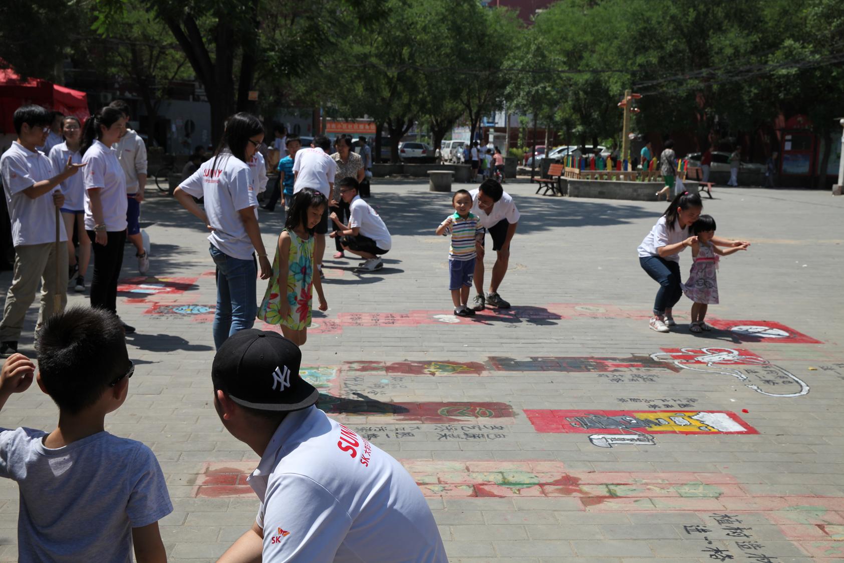 8日早上,志愿者们在地绘部分带孩子们进行“跳格子”游戏。为吸引更多居民的关注,队员们随着音乐一起跳起了集体舞,社区的小广场顿时聚集了很多居民,小朋友们也非常开心地同志愿者们进行着游戏。下午,由于下起大雨,户外活动无法正常进行,因此将微讲堂的地点改到了社区居委会内。尽管天公不作美,但仍然有居民主动来居委会找到志愿者,参与了所有的课程及展示。