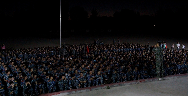 8月27日晚,为丰富军训生活,军训团组织学员们集体观看现代军事战争片《战狼》。同学们热情高涨,很早就踏着整齐的步伐来到了操场。电影准备期间,同学们面向主席台在教官的带领下进行有秩序的拉歌比赛。