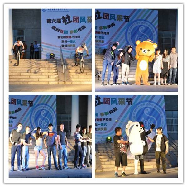 随后,各社团带着自己精心准备的节目一一登场,吉他社动感十足的摇滚歌曲使得台上台下歌声一片;南风动漫社精美的服装与可爱的舞蹈让动漫风席卷全场;“残疾人”艺术团诡异莫测的《变脸》让大家情不自禁的喝彩;趣味横生的魔术则让现场气氛达到了高潮;爱心社、美食社带来的两首独唱再一次引得全场同唱;舞蹈队曼妙的舞姿,街舞社动感十足舞步,人文舞蹈学院带来优雅的国标舞,瑜伽社的肚皮舞,S12动漫社的舞蹈也令人拍案叫绝。最后,开幕式在B—box社团深情的歌声中落下帷幕。