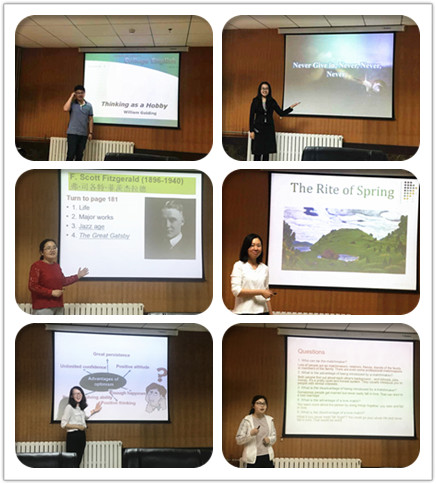 本次选拔赛要求参赛教师展示20分钟的全英教学课,旨在考察教师的课堂教学能力和教学业务水平。吴银燕老师展示了一堂精彩的美国文学课,介绍了作家菲茨杰拉德和他的经典作品《伟大的盖茨比》;郭赛老师分析了一篇丘吉尔在二战期间鼓舞人心的演讲;王佩玉老师阳光自信的展示了《选择乐观》;杜喜义老师通过对几幅图片不同角度的思考,引出了《思考作为一种嗜好》;王琳瑶老师展示了一堂活跃的听力课;张艳老师展示了一堂精读课《春的洗礼》。经过紧张激烈的角逐,最终,郭赛老师和王佩玉老师将代表学院参加第九届“外教社杯”全国高校外语教学大赛的复赛。