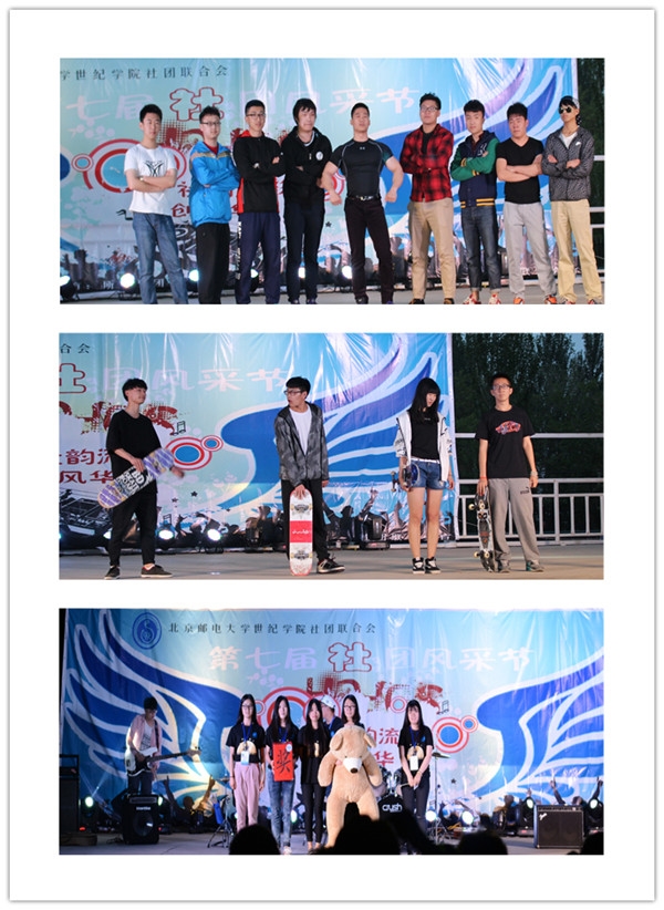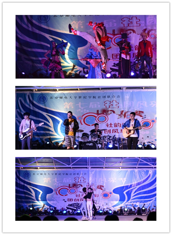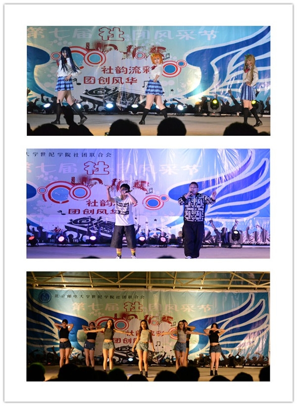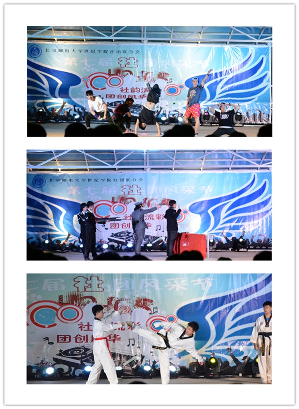 开幕式第一项是传统的社团走秀活动,各个社团精心准备,依次上台展示风采。开幕式演出环节在舞蹈《鞋子特大号》中拉开帷幕,顿时运动场内阵阵欢声。晚会的节目丰富多彩,集舞蹈、歌曲、舞台剧、乐器、cos-play等于一体。说唱社带来了说唱歌曲《我爱天安门》《我算明白了》,强烈的节奏感带起了观众的热情,获得观众一致好评。骑迹车协的《山地车跳台技巧》中惊险刺激的技巧展示引来台下的阵阵尖叫,与台下观众的互动更活跃了现场的气氛!瑜伽社的瑜伽表演伴随着优美的音乐将观众带入轻松、欢快的氛围。街舞社动感、奔放的街舞使观众尖叫声、掌声连绵不绝。拓梦社创意的串烧让台下的观众们笑声连连,尖叫不断。美食社精湛的机械舞舞蹈与太阳舞社充满青春气息的舞蹈将现场的气氛一次次推向高潮。爱心社恬静的歌声、优美的曲调,让人沉醉。SG2军事模型社的舞台剧《血之德意志》别具一格,匠心独运使全场观众掌声雷动,南风动漫社的LolCosplay使观众喝彩欢呼声不绝如缕,硬汉气息爆棚的跆拳道表演与S12动漫社青春活力的舞蹈将晚会推向另一高潮。台上台下融成了一片欢乐的海洋,最后开幕式表演在吉他社《不说再见》的歌声中拉下帷幕。